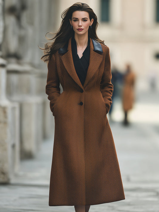 Elegant Herringbone Long Coat With Faux Leather Lapels
