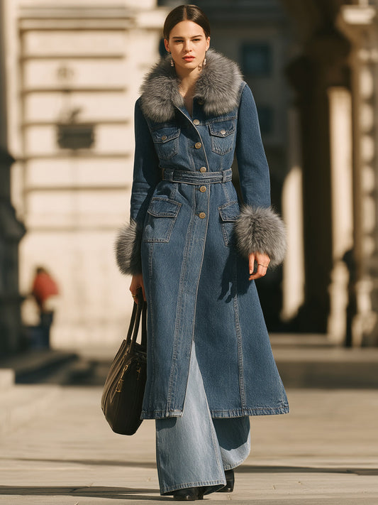 Denim Trench Coat With Faux Fur Collar And Cuffs