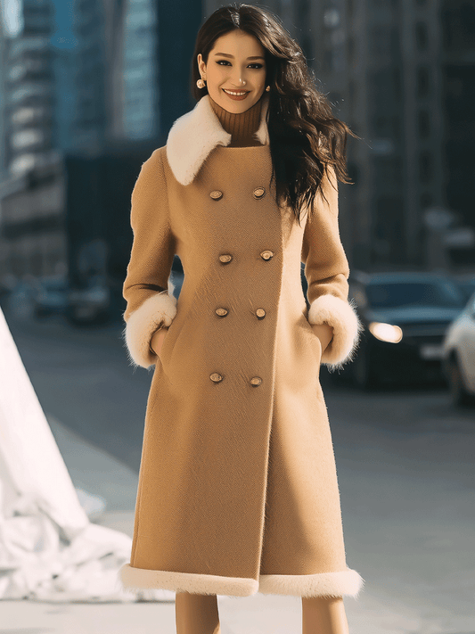 Camel Double-Breasted Coat With Contrast Fur Trim