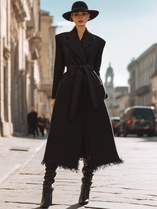 Black Belted Fringe-Trim Coat