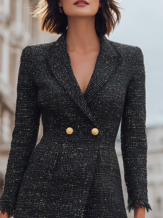 Fringed Hem Tweed Blazer Dress With Gold Buttons