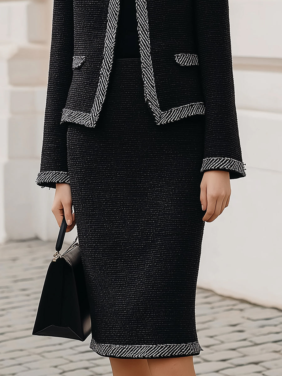 Mooyius presents a refined two-piece skirt suit designed for the modern professional woman who values understated sophistication. This black tweed ensemble is elegantly accented with contrasting woven trim in a subtle monochrome palette, lending a polished finish to its timeless silhouette.